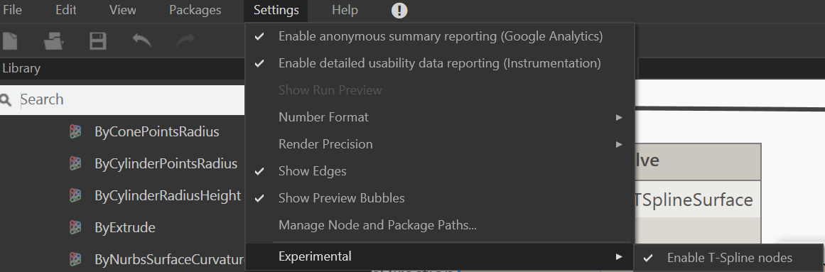 To expose the tools, go to Settings > Experimental menu and check “T-Splines”, then restart your Dynamo instance. You will now find the nodes available in the Geometry menu. Currently there are about 150 new nodes that are a subset of the existing geometry library. The new functionality offers a wide range of capabilities to create and edit T-Spline surfaces and also conversion to and from NURBS and meshes.