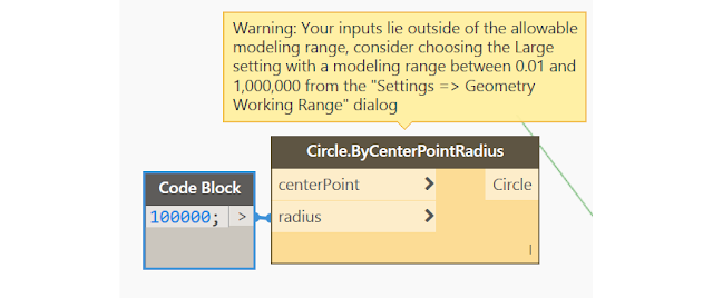 For folks who have had trouble with geometric operations in models with large numbers (buildings and landscape projects described in millimeters), we added a solution that adjusts numerical precision to accommodate these large numbers. For these projects, adjust your Geometry Working Range in the Settings menu.  The basic idea is that Dynamo’s geometry tools have an out-of-the-box working range of 10,000  to 0.000001. This is a problem when you are thinking about your geometry in large numbers, and is a waste of all the teeny, tiny zeros that you don’t need. Geometry scaling essentially moves the decimal point over to the right. Longer post on this to follow.
