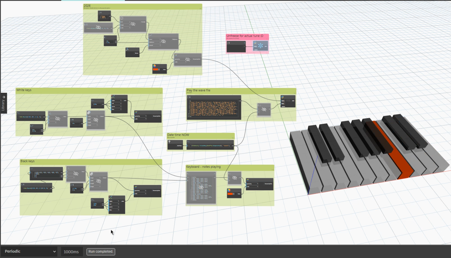 As the tune plays, a miniature piano — created entirely with Dynamo geometry — lights up the correct key in real time, colouring each note as it sounds.