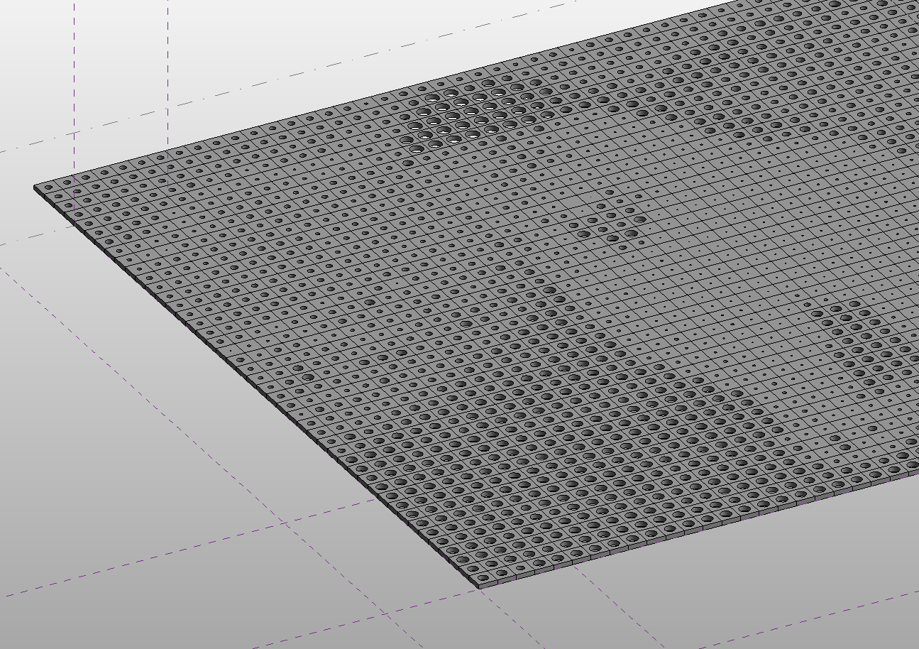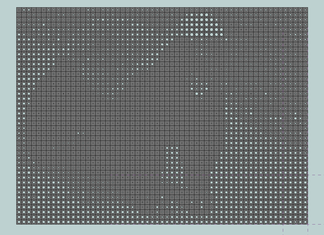 I added a couple of nodes this evening (available only in the source) that assist in the processing of image files. The image file reader node takes a file path as an input and some X and Y division values, returning an array of Color objects corresponding to the sample points in the image in X and Y. The color brightness node can then be used to determine the brightness of these Colors, returning a value between 0 and 1. Here’s an example that I made by creating a 2D array of an aperture tile, and setting the diameter of the tile’s aperture to a corresponding brightness value. There’s a bit of weirdness still based on the fact that bitmaps are stored bottom to top and the “cons” operation that I use internally to make a list out of the color samples naturally reverses the list as well, but that’ll get ironed out.