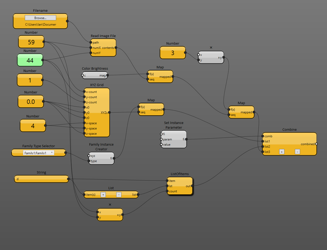 Notice the X and Y sample sizes for the Read Image File node were approximately 1/10 of the original pixel width and height of the image. This keeps things from getting squished. And the List Of Items user node simply creates a list containing the same number of “d” values as there are sample values for use by the Combine node. The Combine node is used to say “For each of the family instances in this list, find the d parameter and set it to the value from this other list.”
