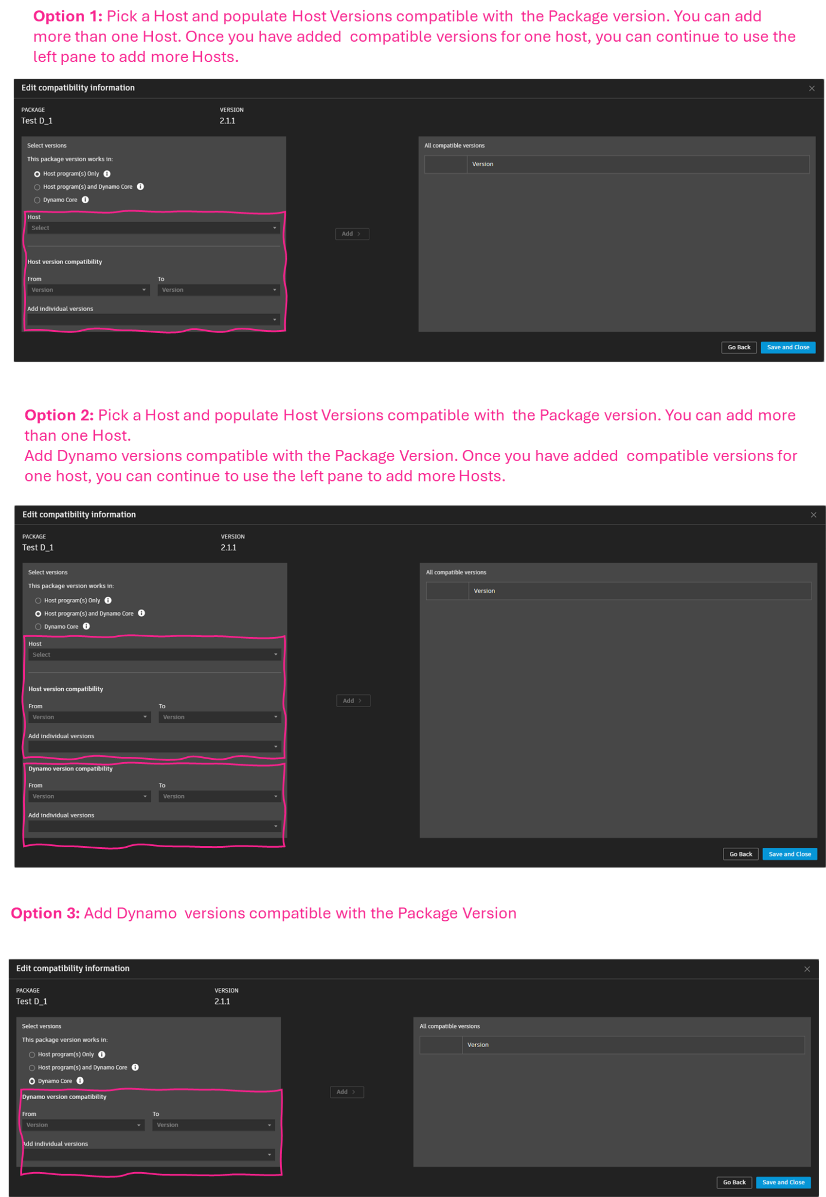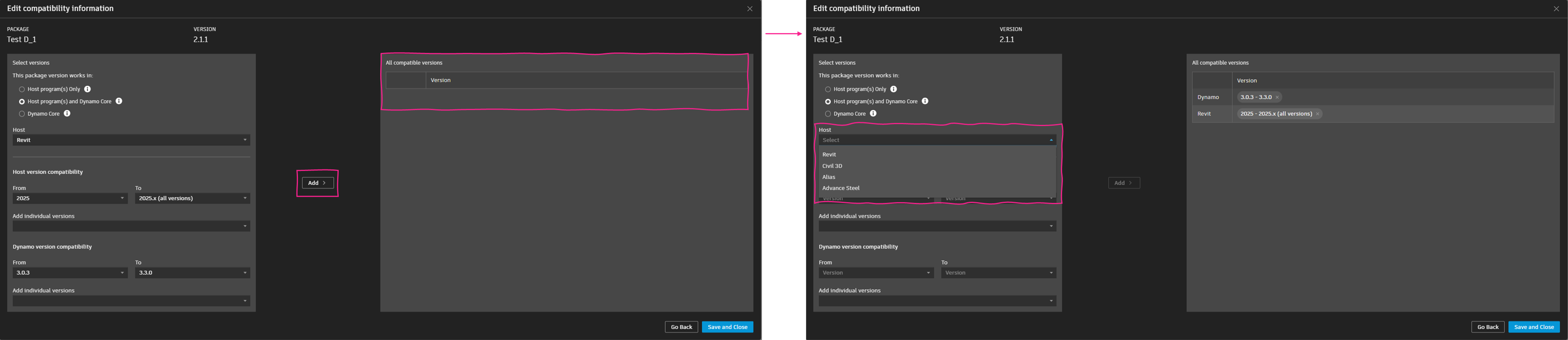 Step 3: To populate the Host and/or Dynamo versions compatible with the package version, a range (From–To) can be added. Or, if needed individual versions can also be selected from the Add individual version drop down.