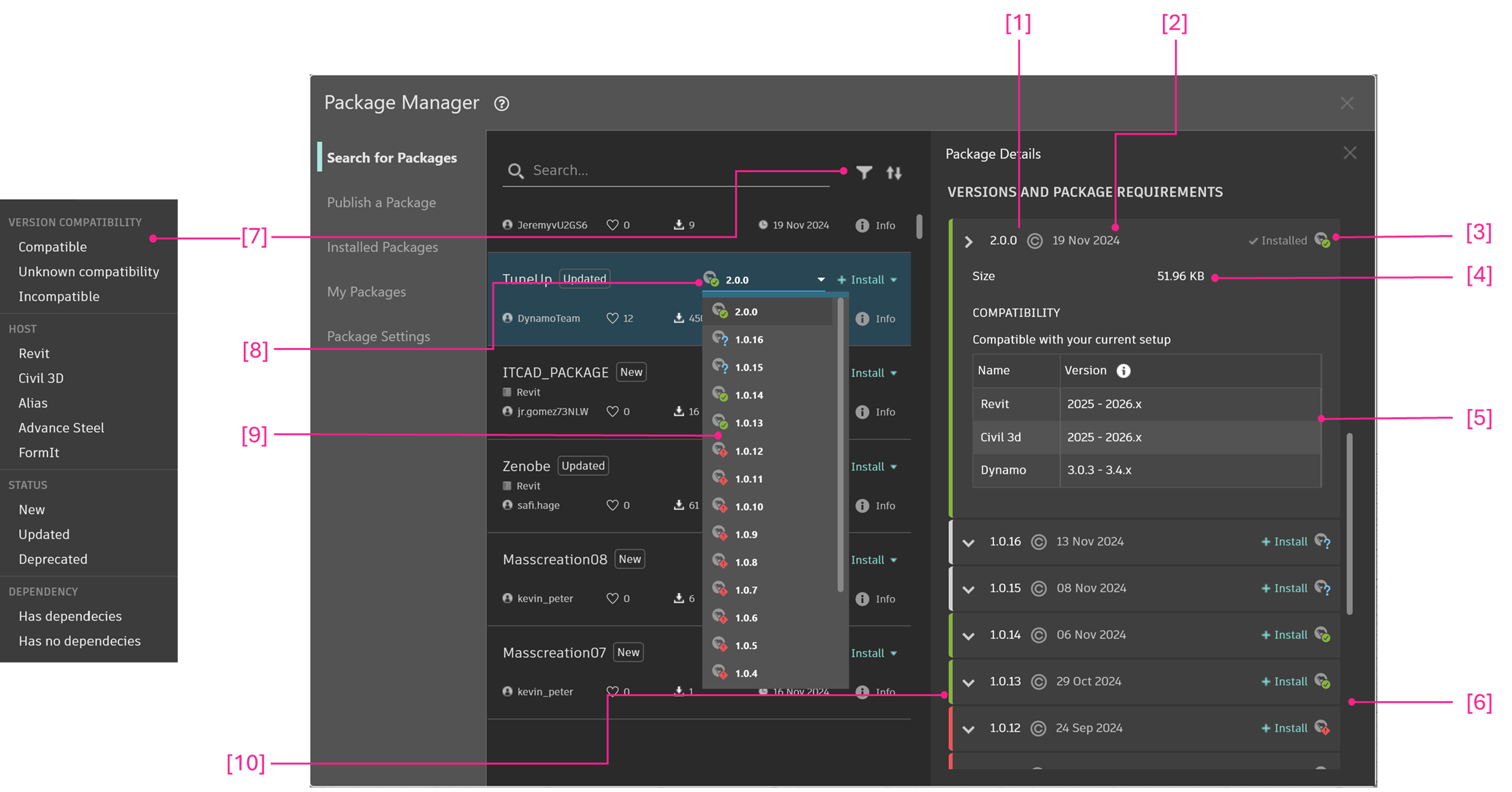 [6] & [10] – Compatibility status icons to inform users which version of the package is compatible with their Dynamo setup when compatibility information has been provided by authors. We have also included status bars, so it’s hard to miss for users whether a package version is compatible with their setup or not.