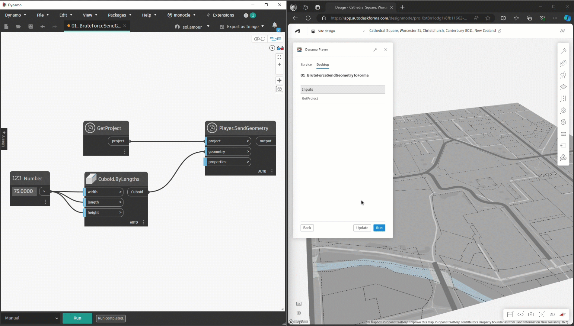 The release of Dynamo in Forma Beta in November 2023 powered a variety of design automation capabilities in Forma through Dynamo Player. Accessed through a Dynamo package, Dynamo Player was an extension that connected Forma to Dynamo desktop for graph execution. It allowed users to leverage Dynamo’s functionality inside Forma in a simplified way with a friendly user interface.