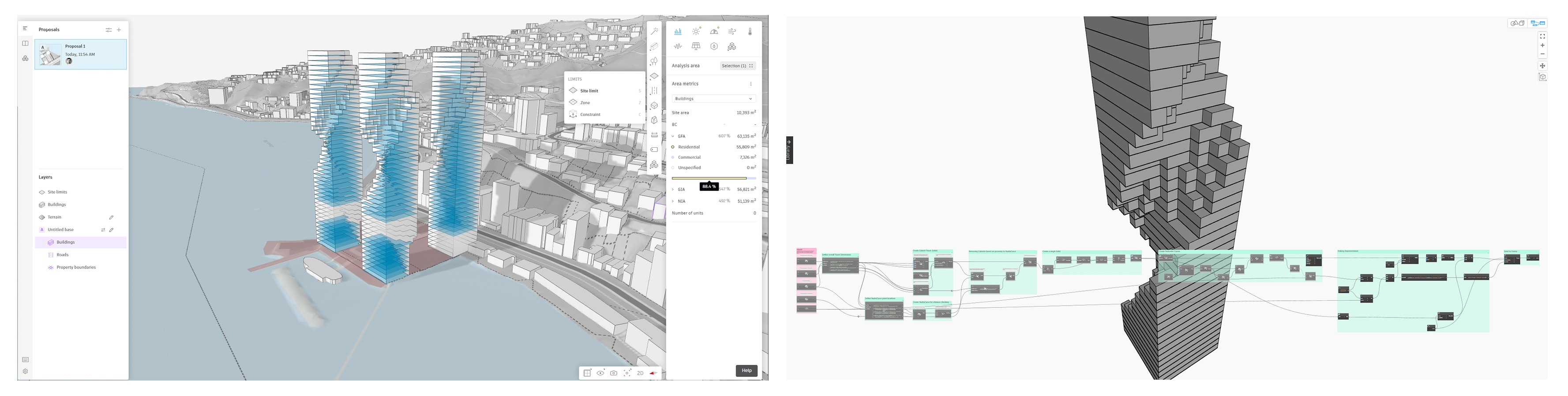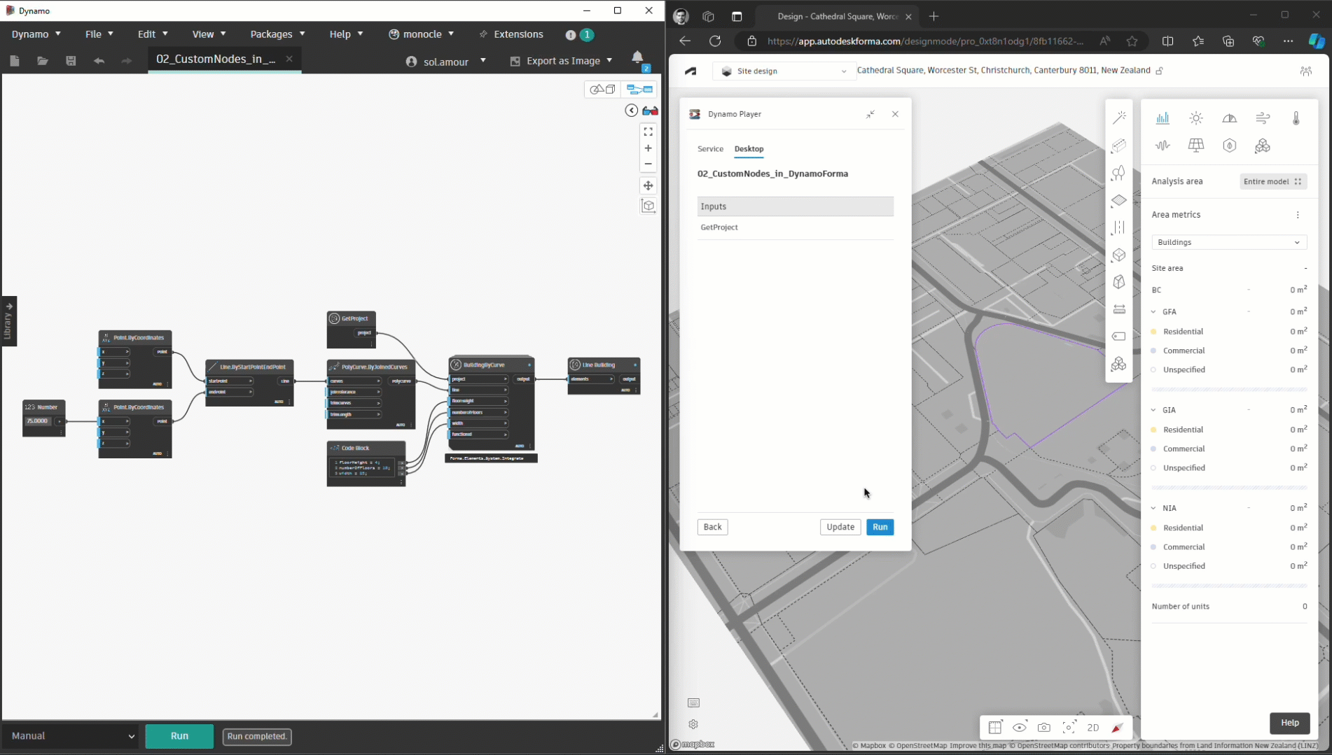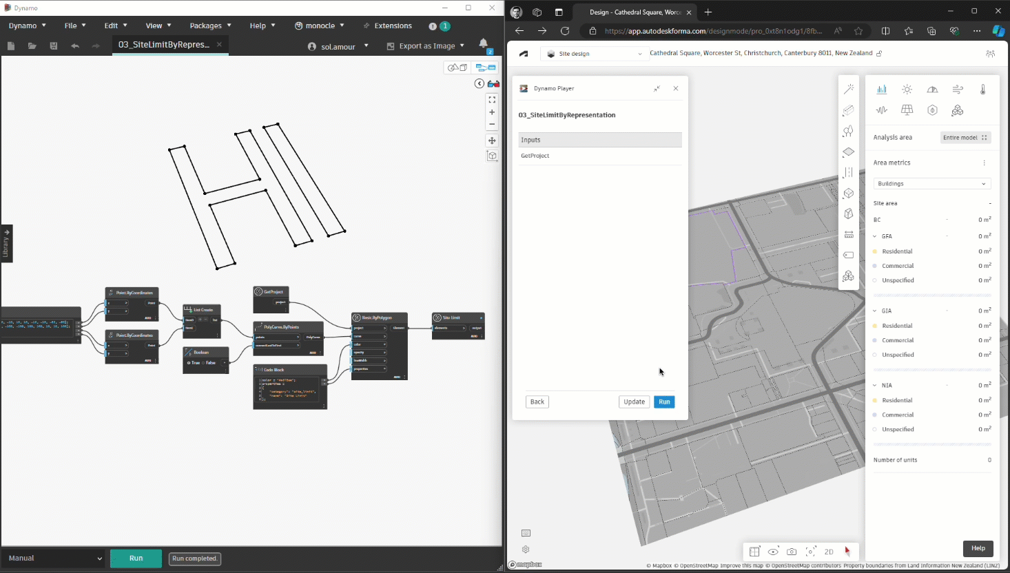 While the samples were a first step toward Dynamo-powered Forma workflows, the objects created through Dynamo Player were not Forma elements. Rather, they were meshes sent to Forma, meaning that users had to manually configure things like buildings, floors, and functions using 3D Sketch, a native tool on the Forma side.