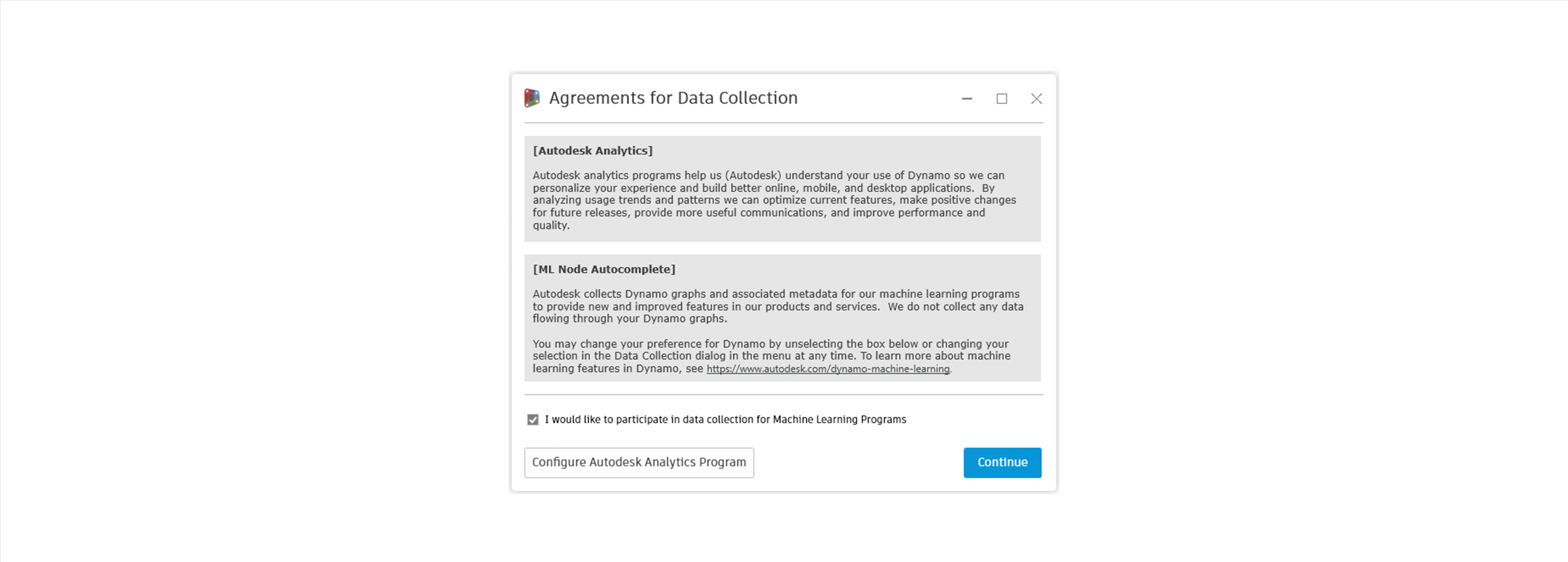 Autodesk collects Dynamo usage data to personalize and improve our users’ experience. But we want to keep you informed and help you stay in charge of your data. That’s why we’ve added new Agreements for Data Collection in the top menu under Dynamo. This dialog provides information about how and why data is collected during Dynamo usage.