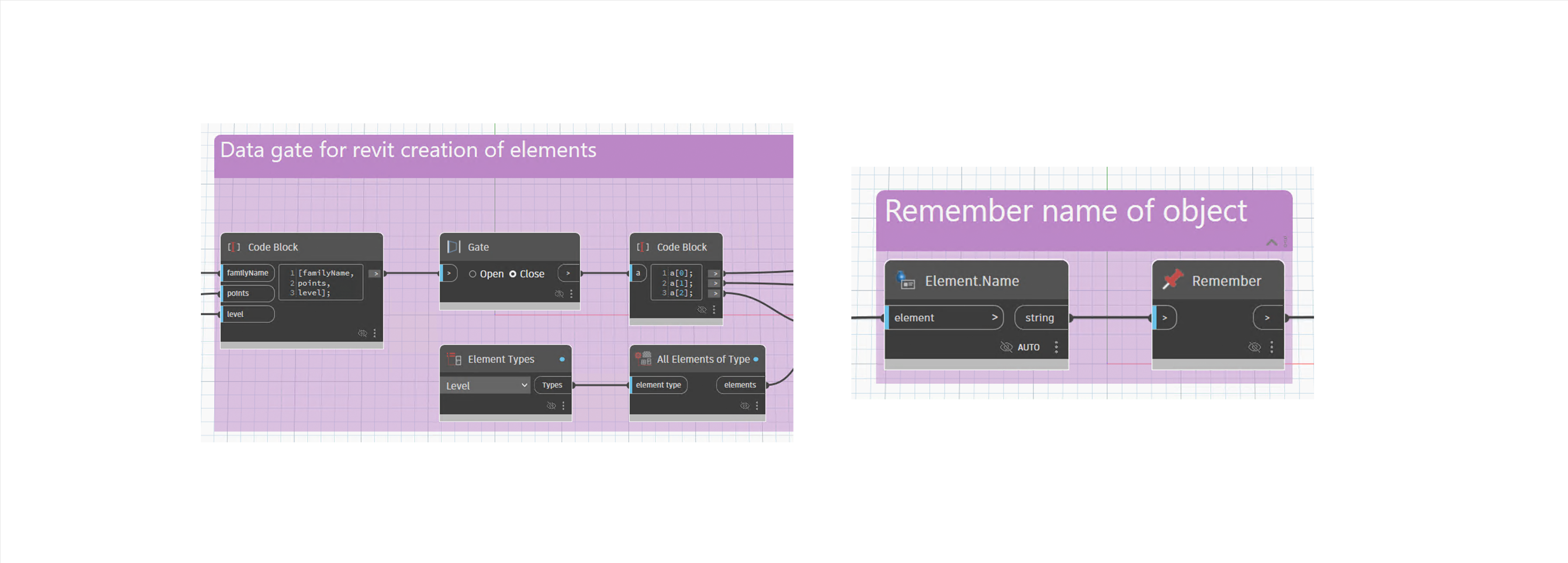The standard Dynamo library now includes the Gate and Remember nodes. The Gate node allows you control the execution in sections of your graph. An open Gate passes data through unchanged, while a closed Gate sends no data downstream—similar to freezing a node, but in the form of a separate node. A Remember node stores the data passing through it to the Dynamo file and returns the stored data if the input is null.