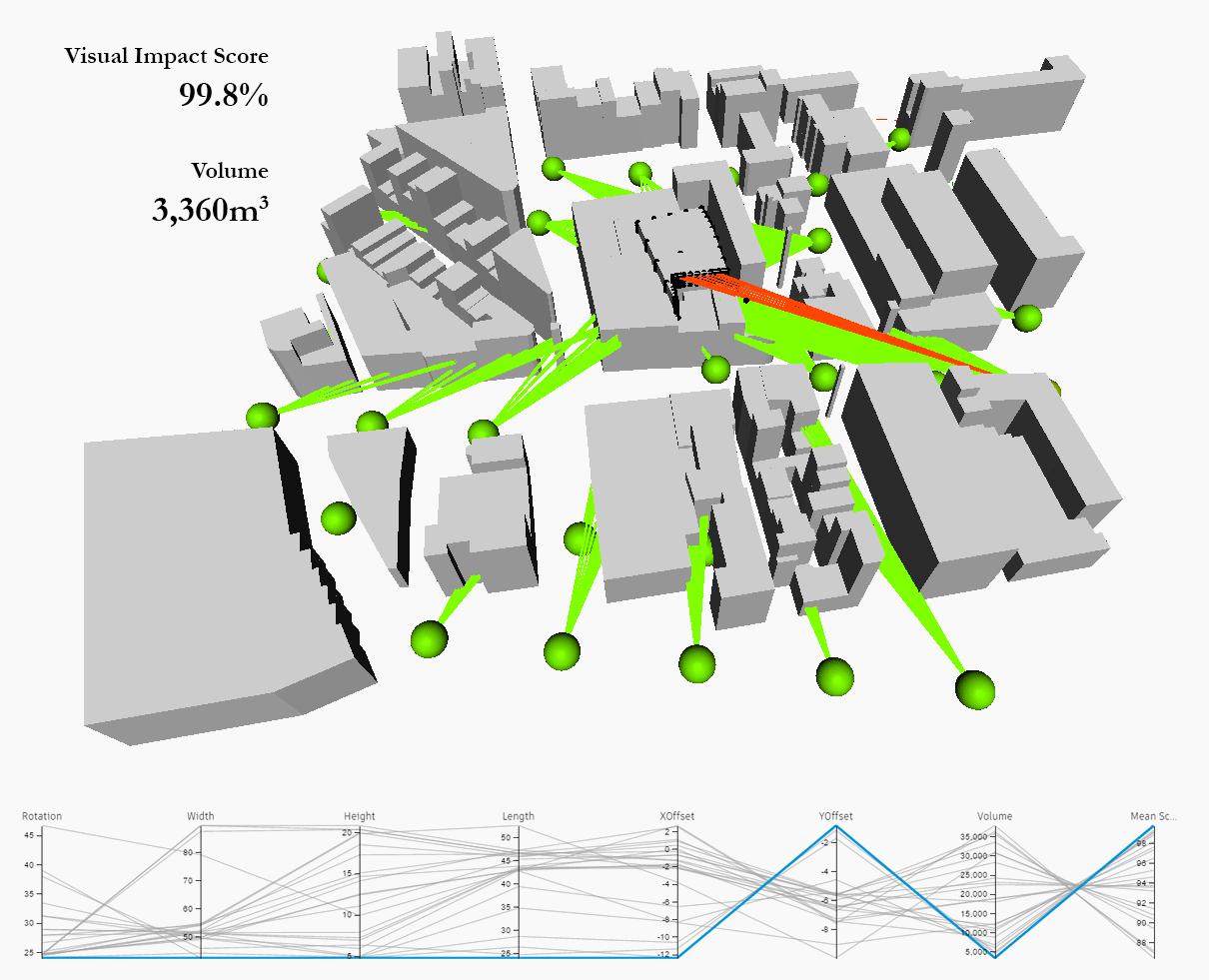 Our idea was to develop a tool for generating and assessing the visual impact of potential rooftop additions in a three-dimensional environment whereas so many studies are currently conducted in two dimensions only. We aimed to give a designer an initial set of massing options and their relative visual impact scores in order to inform further design development.