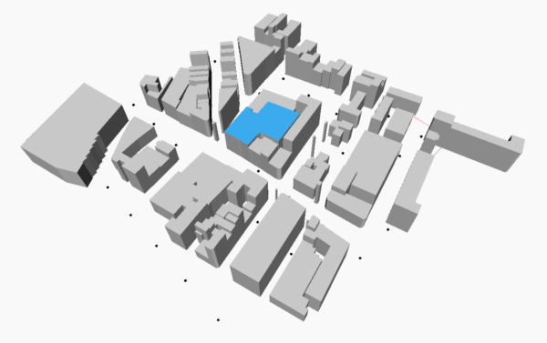 We spent a large part of the first day trying to work out a suitable method for assessing the visual impact from a particular viewpoint. After experimenting with several different methods, including isovists and projecting geometry onto a plane to measure areas, we settled on the relatively simple method of dividing the visible surfaces of the rooftop addition into panels using the Lunchbox package and then testing whether each panel could be seen from each viewpoint or was blocked by surrounding buildings. The score for each viewpoint is the percentage of panels that cannot be seen from the viewpoint. The higher the percentage, the less of the addition can be seen from the viewpoint. The total score is the average of all of the viewpoints and which we referred to as the Mean Score. Currently, the viewpoints are all treated equally but a future enhancement would be to weight their scores depending on the sensitivity of the street. For example, viewpoints that look towards buildings of historic significance would count more to the scoring than viewpoints from a back street. The designer would then be able to take into account these restrictions when developing the design.