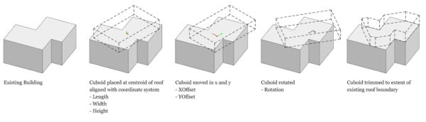 The second Dynamo graph creates and assesses potential rooftop additions. We wanted the tool to generate potential forms rather than just be a tool for assessing proposals. To keep it simple for the time constraints of a hackathon we chose to use a basic cuboid that could be controlled with a minimal number of parameters. At this stage, we also decided to use volume as the measurement that we would assess the viability of the scheme in financial terms. The useable areas within the addition would be a more accurate measure but would have required more work. The cuboid is defined by a length, width and height around an origin that can be offset in X and Y from the centroid of the roof surface. The cuboid can be rotated to give a wide variety of possible configurations from just six parameters. If the cuboid overhangs the roof polygon, it is trimmed so that it is entirely within the boundary of the existing building.