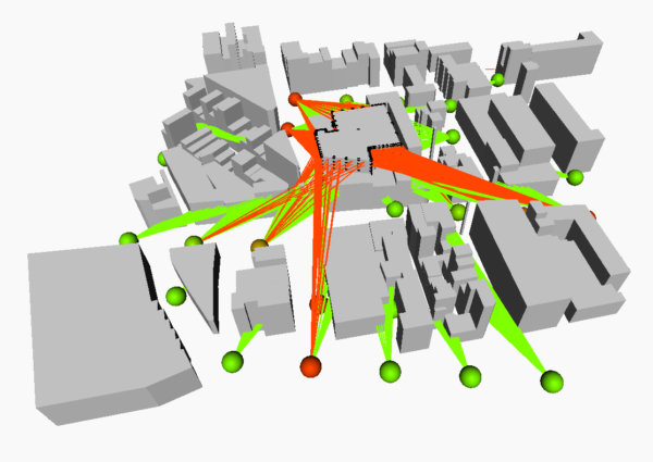 For expediency, we used the same panel division for all faces, so a large face has larger panels than a small face. However, it would be more accurate to have panels of the same size across all faces so we plan to implement this as a future refinement. In Dynamo we showed the sightlines coloured according to whether the sightline can see the rooftop addition (red – fail) or not (green – pass). Each viewpoint is shown as a sphere coloured according to their percentage score (green is 100%, red is 0%). In tight urban areas, many of the viewpoints can’t see the addition and are therefore green.