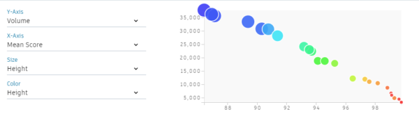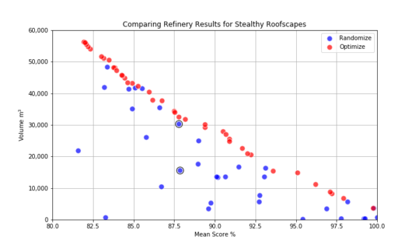 The majority of the Randomize results are less efficient, where the Volume achieved is less than could otherwise be achieved for the same Mean Score. For example, there are two results circled in black that achieve a Mean Score of 88% but one (right) has double the Volume. The smaller is prominently located on a visible corner and doesn’t make use of the more hidden part of the roof behind the taller adjacent building.