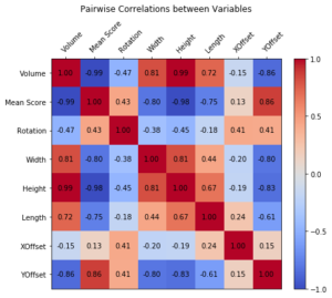 The Height and Volume are strongly correlated which is also to be expected. A closer examination of the pairwise correlations between the variables reveals some obvious results: the dimensions of the cuboid (Length, Width and Height) are fairly strongly correlated with the Volume and negatively with the Mean Score. More subtle (and useful) are the offsets which indicate that the XOffset has little bearing on the Mean Score, but the YOffset is negatively correlated which means that moving the cuboid south produces better scores for this situation because that part of the roof is more hidden by an adjacent building. The YOffset range can then can be adjusted to focus on this area for further passes with Refinery.