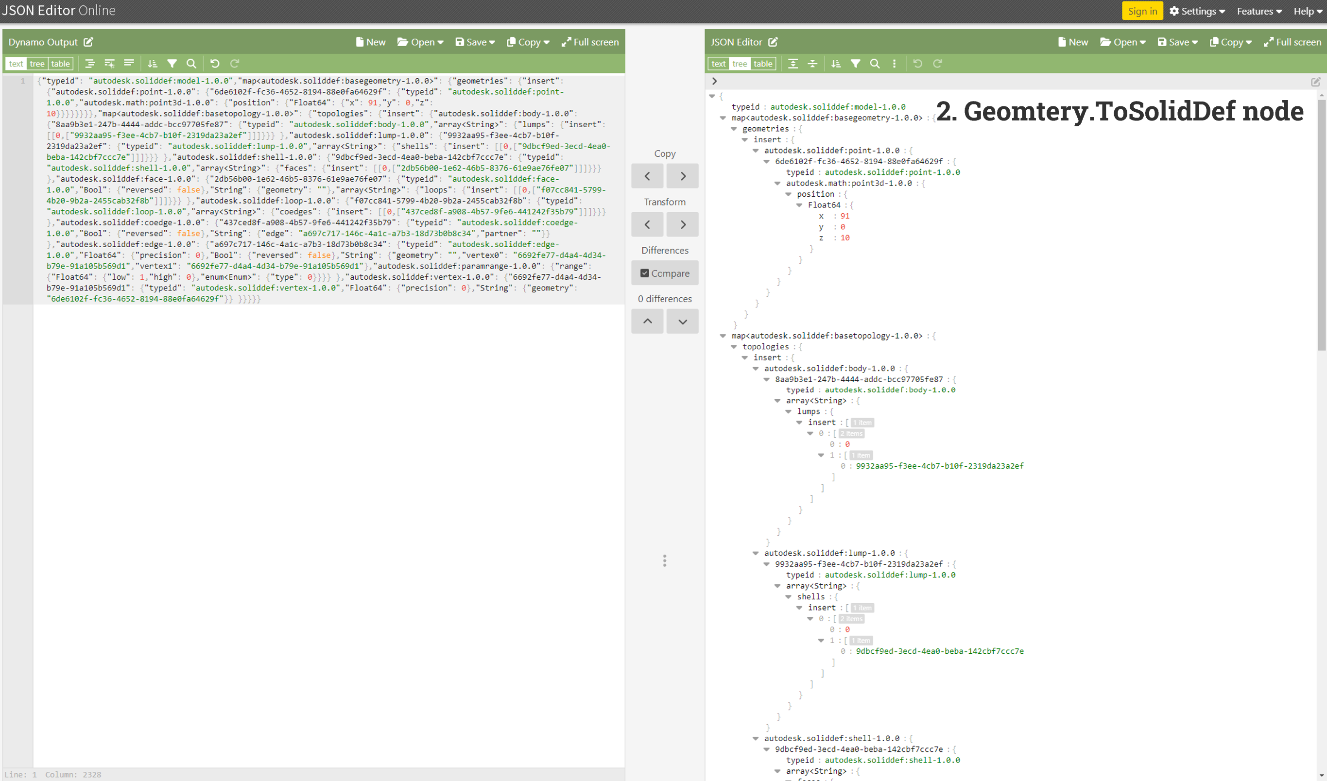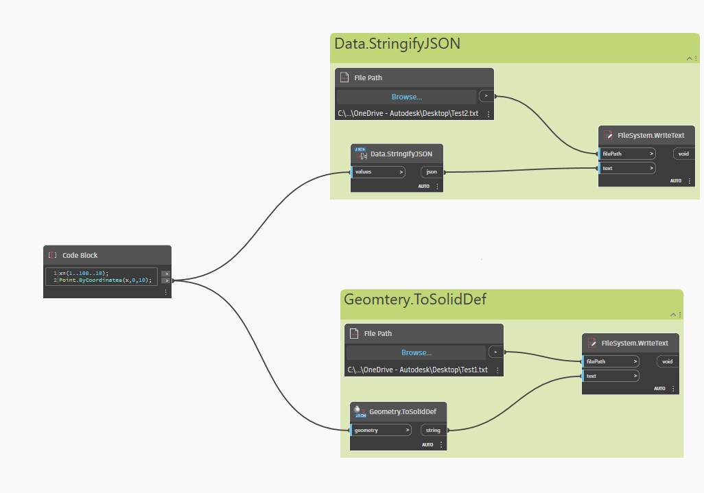 On the other hand, the Geometry.ToSolidDef node in Dynamo is a function specific to the Dynamo. This node converts geometric data into a solid definition that can be used to store and recreate geometry objects. Let’s see how these two are different with an example.