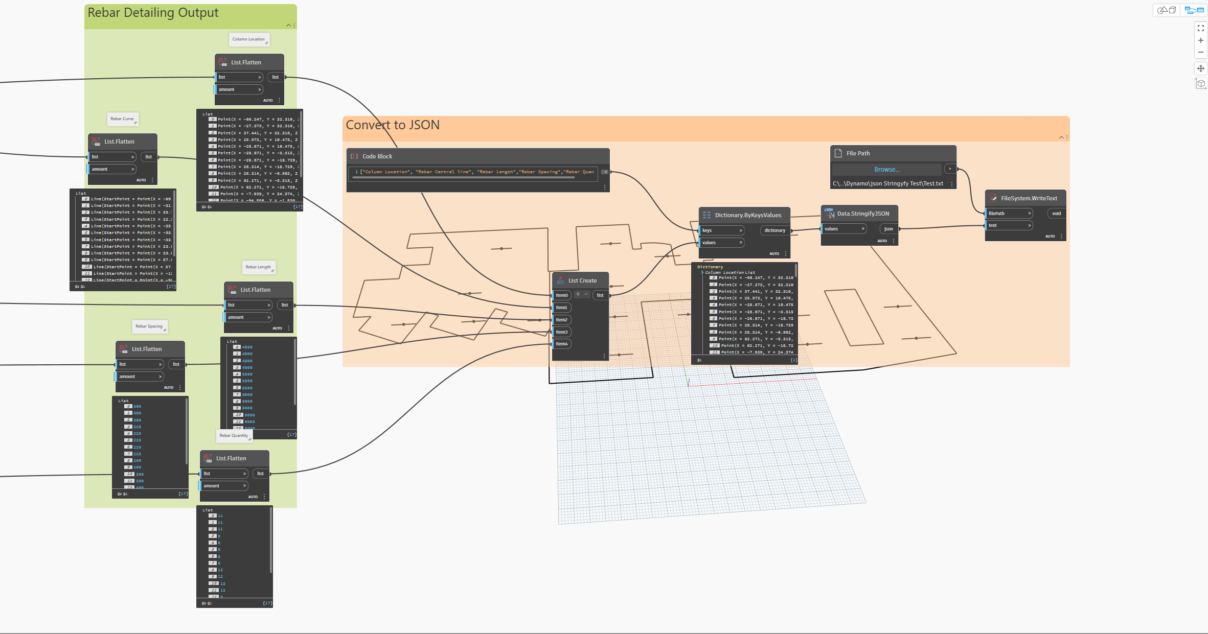 Now, let’s reimagine this process using Data.StringifyJSON node. In this simplified example, let’s assume that the data that the BIM Manager required for slab reinforcement detailing is limited to the column locations (Point), rebar central curves (Curve), rebar lengths, rebar quantities, and rebar spacings (Integers).