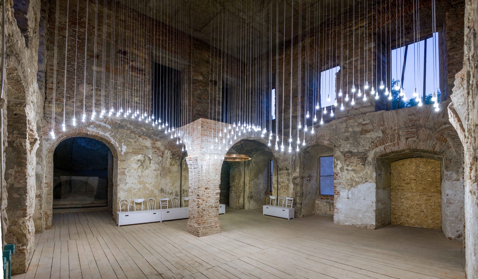 A very interesting project dealing with a similar principle is a transformation of the castle space into a workshop and a multifunctional hall in Romania called Gallery Reframe design by Alexandru Fleșeriu + Péter Eszter. In this project, the destroyed vaults were reconstructed by replacing them with lights placed at the same height where the vault was once demolished. I consider this project a very successful idea of how to work with historical buildings and preserve their character in the future.