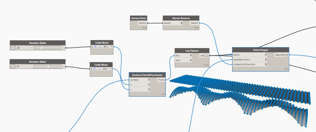 The second part of the script is to define points, ie positions for each individual light family, first on the ceiling surface and secondly by projecting these points on the vault surface. The number of points is simply defined by the code block and the Surface.PointAtParameter node. The points are then projected along the z vector onto the vault surface.