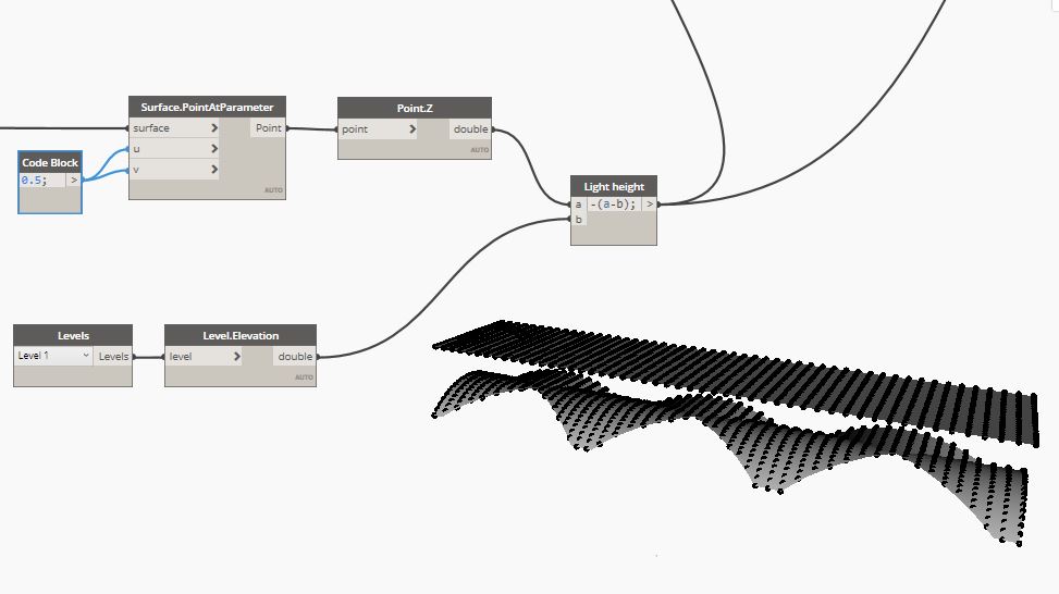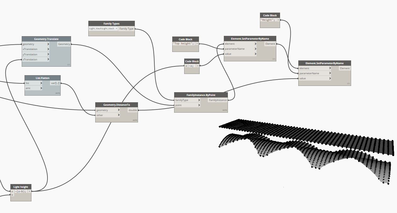 Finally, the second parameter of the length of each light is calculated using the Geometry.DistanceTo function, which is used to determine the distance between the points on the ceiling and the points on the vault. Eventually, the light families are placed on the appropriate level and both height/length parameters are defined.