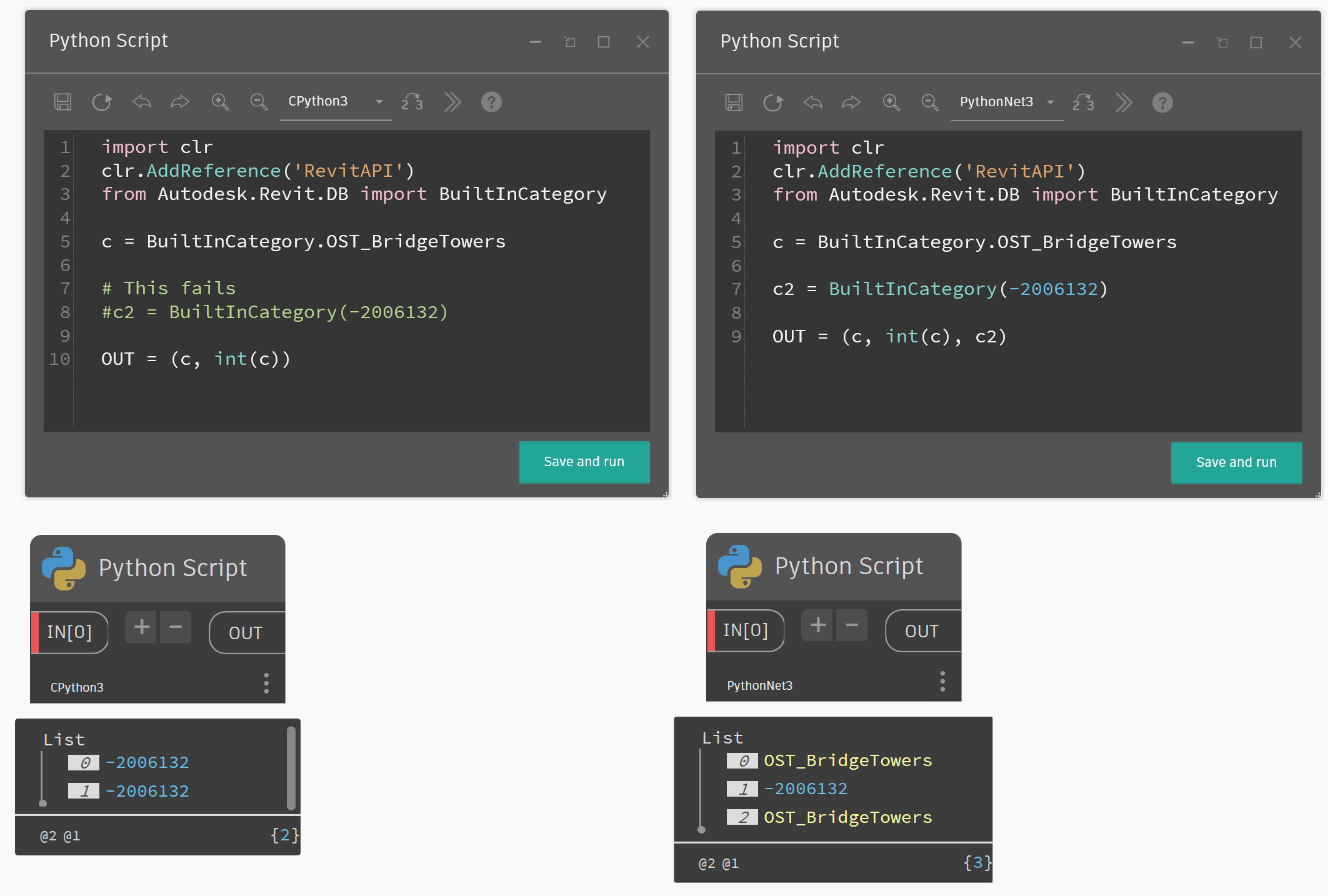 How hard can it be? You just run a Python script and return the result! And yes, if all we wanted to do was send text and numbers back and forth from Dynamo to our Python scripts, we wouldn’t need all this fuss. But we want to do a lot more than that. We want to send complex objects and geometry back and forth and we want to use Python to define logic for Dynamo’s hosts to use, for example to define filtering logic for a Revit element collector. This is hard to support because Dynamo and its hosts exist in a separate world from the world Python code typically exists in. Dynamo runs inside of the .NET runtime environment, while Python is typically interpreted and executed by CPython, the reference implementation of the Python language, written in C. This means Dynamo and Python have very different ways of representing objects and functions and, except in very simple cases, converting between the two is hard. There are two main solutions out there to deal with this gap: