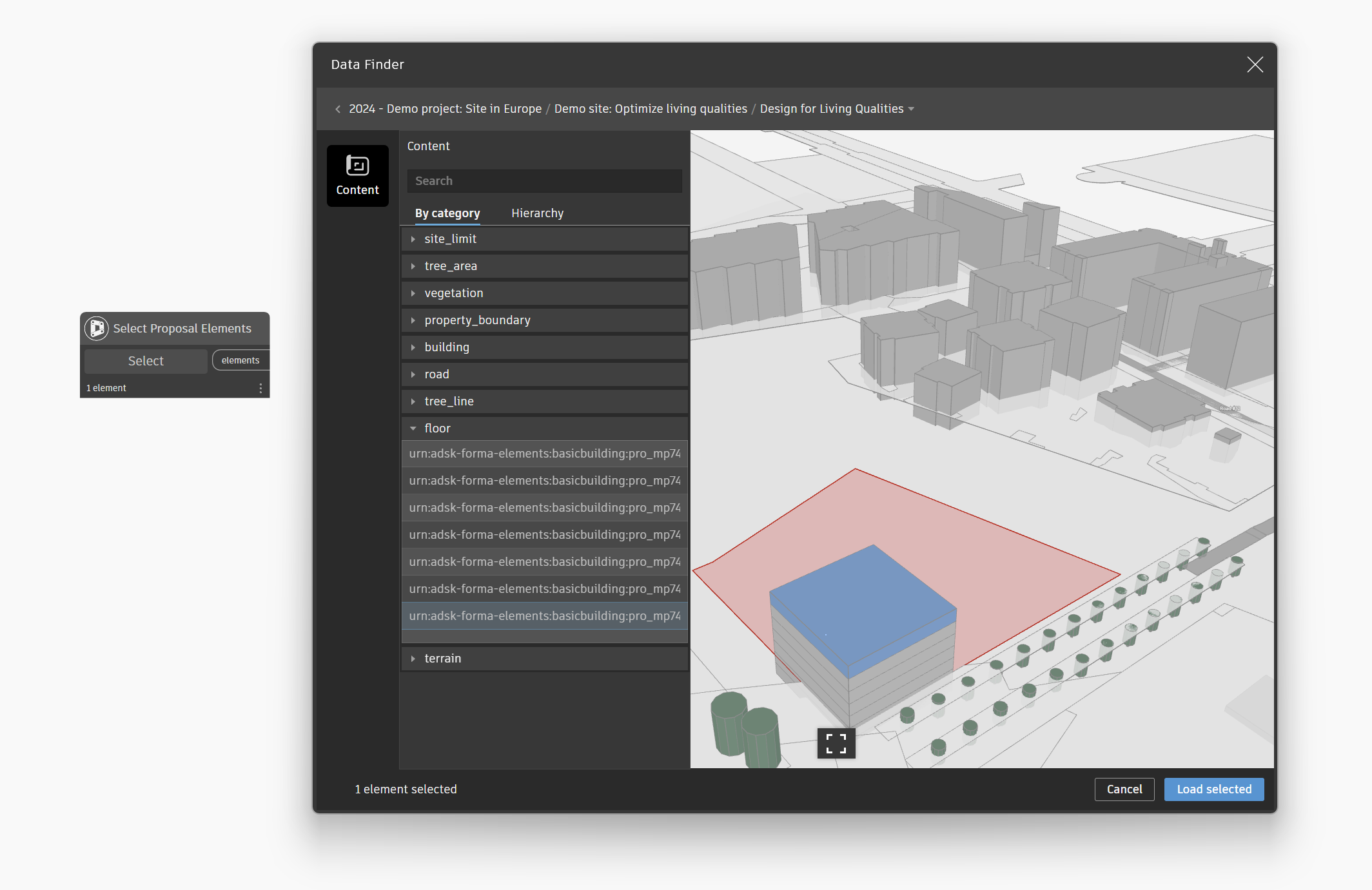The Select Proposal Elements node is the first step toward a more unified and accessible data workflow in Dynamo. You can use it together with Select Site and Send To Forma Proposal nodes to get and send data to Forma without opening Forma. It also helps you: