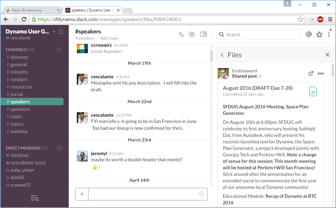 The first meeting last year started with a call of volunteers to join the SFDUG Committee; within the pool of raised hands I was pleased to find representatives from academia, design firms, and software developers, and soon after that first meeting we held our first committee meeting online. Each committee meeting flourishes with ideas and discussions. From the beginning we drafted a simple goal: to provide high quality Dynamo learning content by top industry leaders available to the widest audience possible. Achieving this goal would require developing an efficient team strategy with identified tasks and distributed responsibilities.